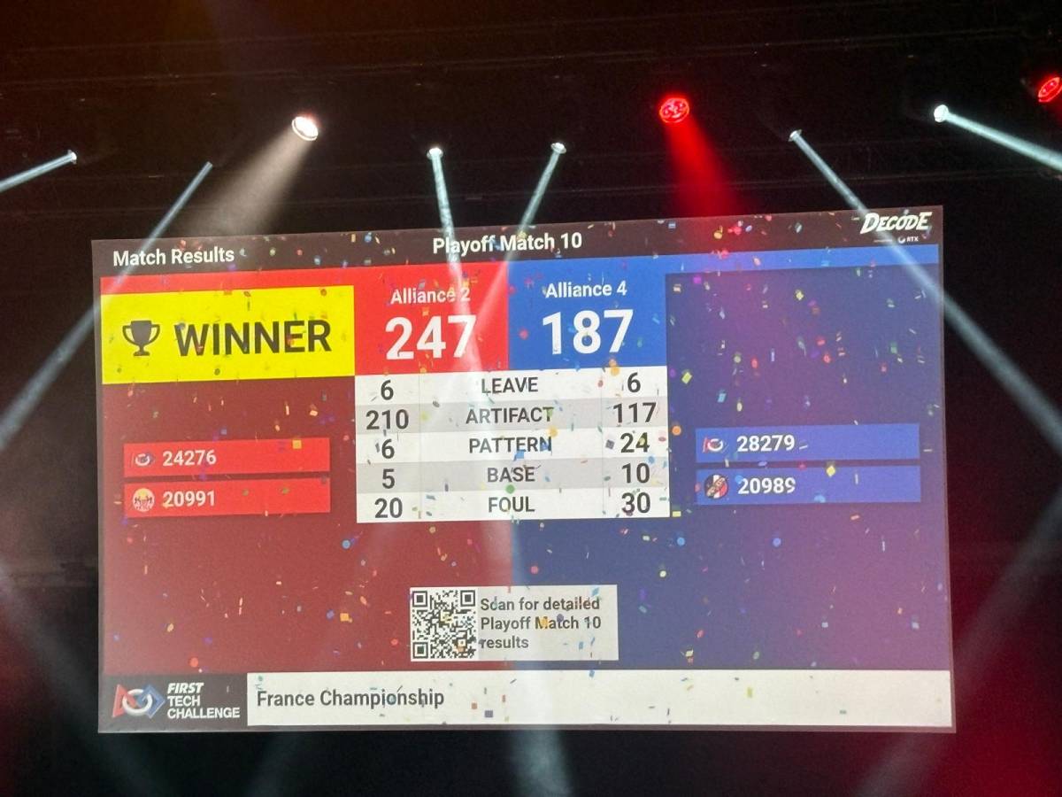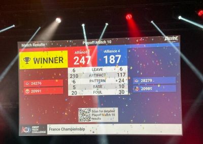 Pour cette partie de la compétition, nous avons joué en alliance avec les BaguetTechs de Valbonne. Tout s’est très bien déroulé et notre équipe a réussi à atteindre le match final. Entre temps, nous avons reçu le Prix de la Pensée, celui-ci récompense différentes aptitudes. Les jurys ont apprécié le design de la carrosserie et la qualité de la mécanique, notre réflexion autour du programme, et tous les éléments choisis importants dans le portfolio. La dernière partie a été très serrée 247 à 187 et nous avons remporté la deuxième place.